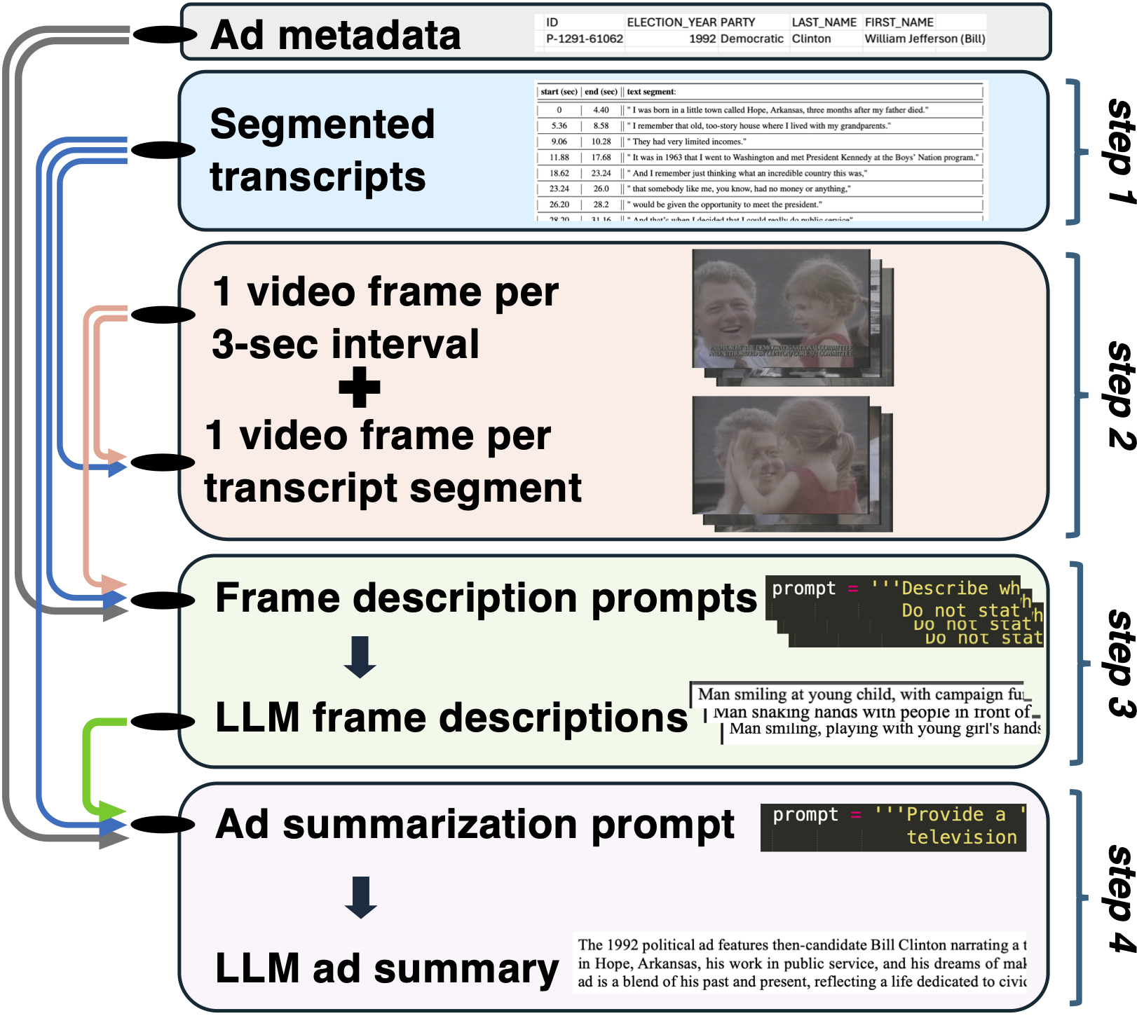 Summary: This paper introduces the largest and most comprehensive dataset of US presidential campaign television advertisements, available in digital format. To facilitate a variety of research, we design a large-scale parallelized, AI-based analysis pipeline that automates the laborious process of preparing, transcribing, and summarizing videos, and we conduct extensive human evaluations to show that these transcripts and summaries match the quality of manually generated alternatives. We illustrate the value of this data by including an application that tracks the genesis and evolution of current focal issue areas over seven decades of presidential elections. Our analysis pipeline and codebase also show how to use LLM-based tools to obtain high-quality summaries for other video datasets.